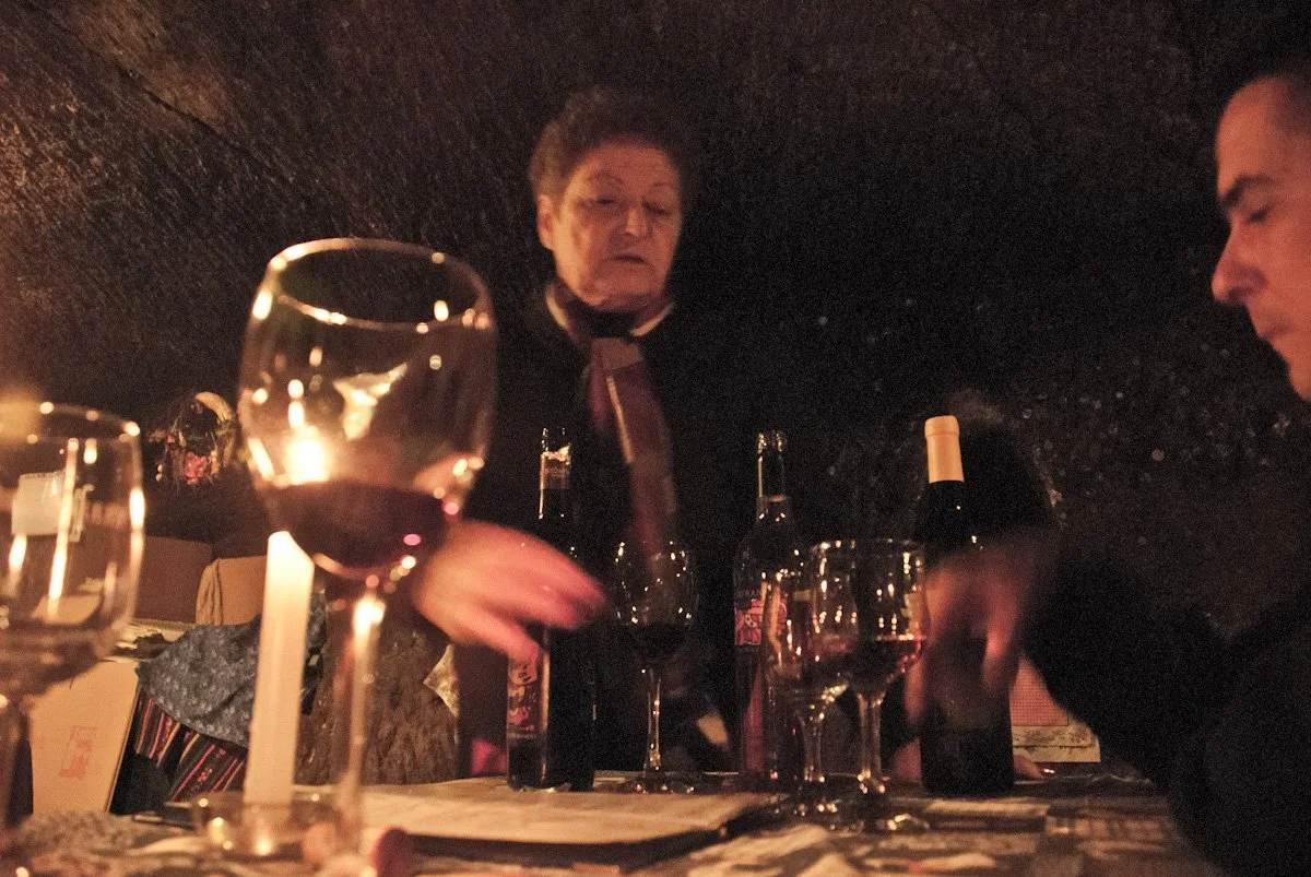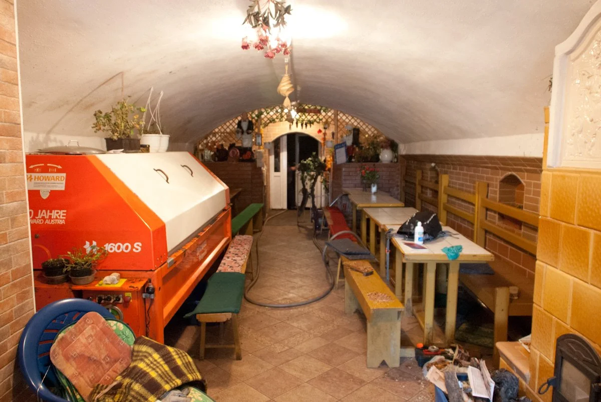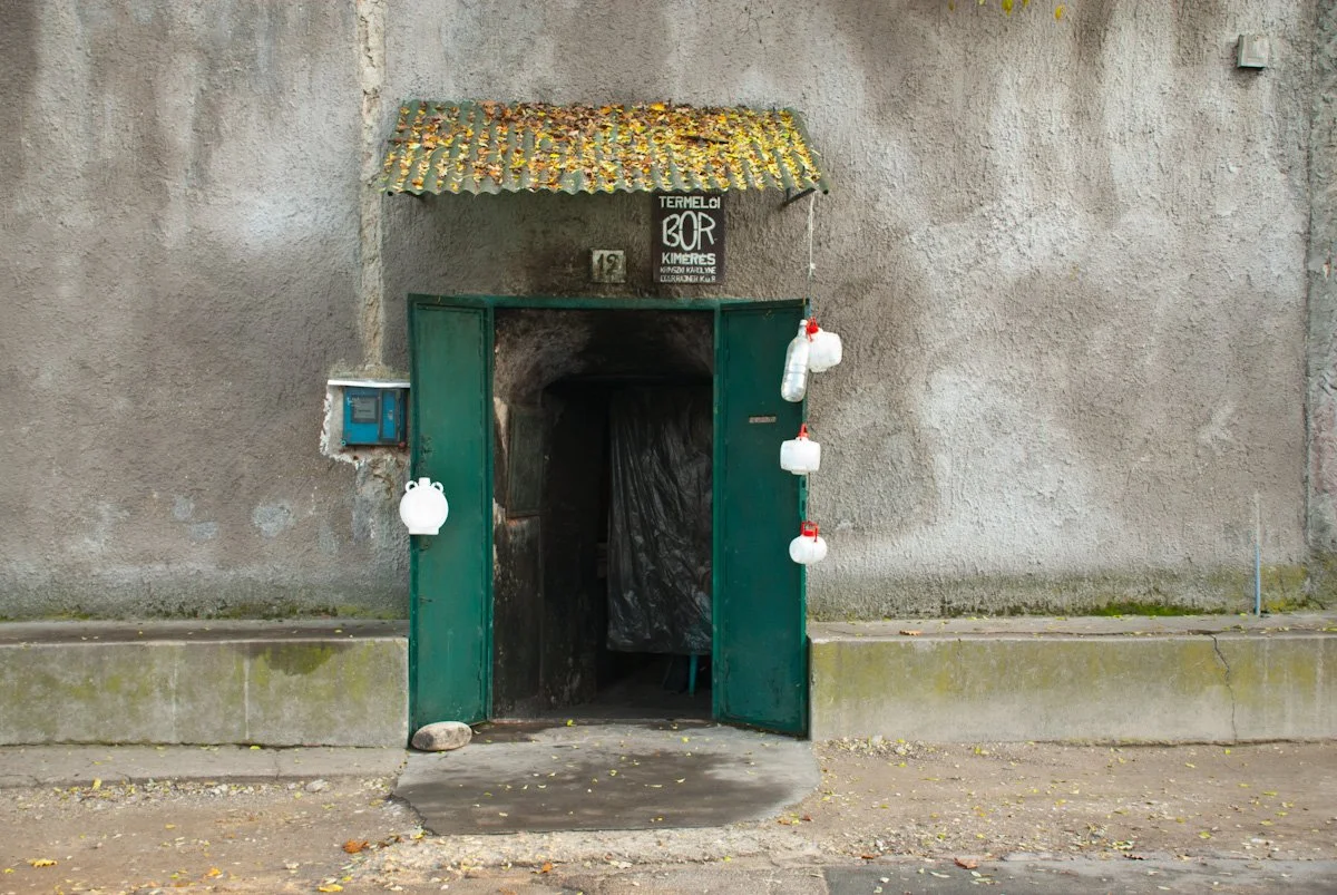 At the end of the evening, I decided to venture down a set of steps at Cellar #2. Nondescript from the outside, a neon ‘NYITOTT” sign (Hungarian for ‘OPEN’) flickering on a and off, I wandered down the stairs into the dark cavern, with coins sticking in the grooves of the gummy walls. I was recognized by a couple of folks I had seen at a previous cellar, and they invited me to join them. Aniko and Zoltan were friends from the southern Hungarian town Szeged, here to visit the cellars and taste some wine. This was by for the most fun, most engaging and lively cellar I had visited all day, and I settled in for a few hours with my new friends, enjoying stores from the entertaining owner. Here cellar was the personal favorite of the National Water Polo team coach, and we she shared his special vintage with us, using a sort of glass pistol, shooting wine into our glasses across the table with pinpoint accuracy.