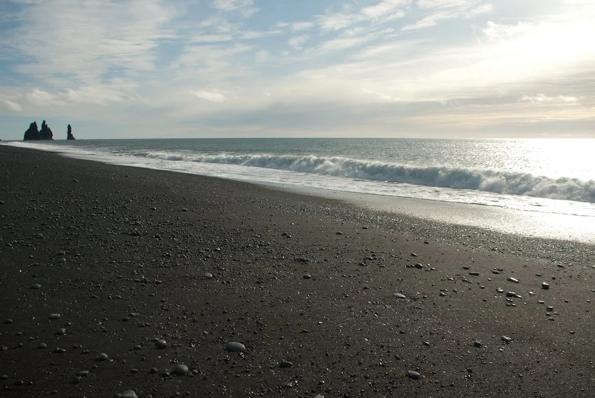 The views at the top were amazing. The coastline in both directions was spectacular. So I circumnavigated the plateau following the edge, peering over the steep cliff faces. At the end of the plateau coming up out of the water were a cluster of sea stacks called the Reynisfjall. I tooled around for a while and headed back down the switchbacks into the village...