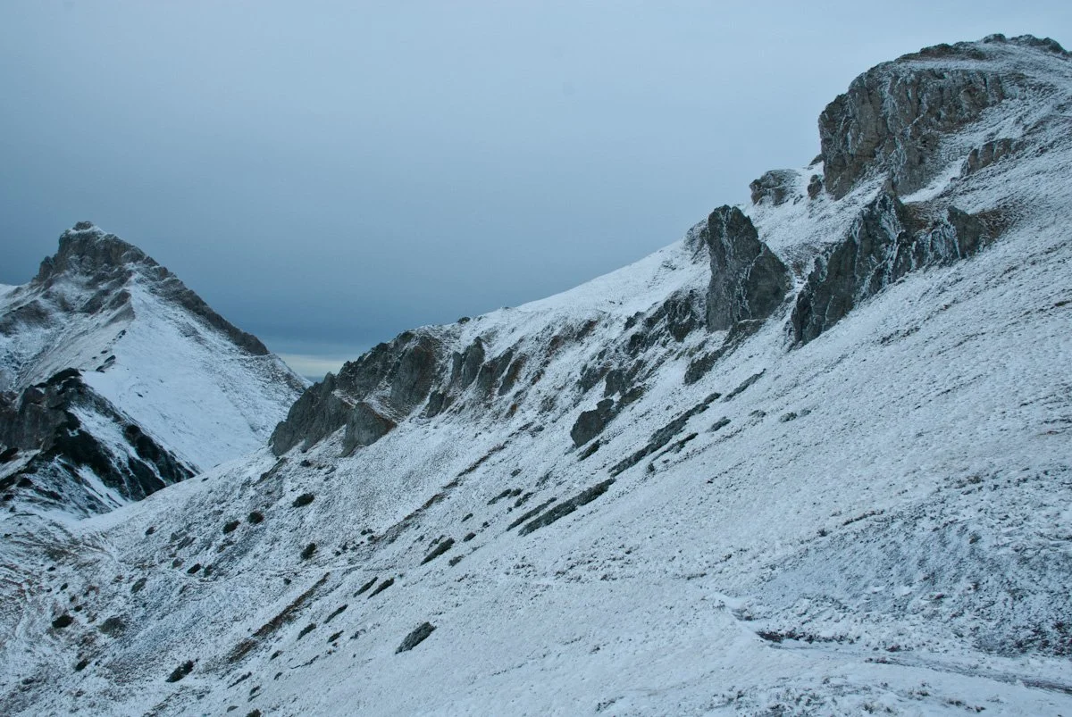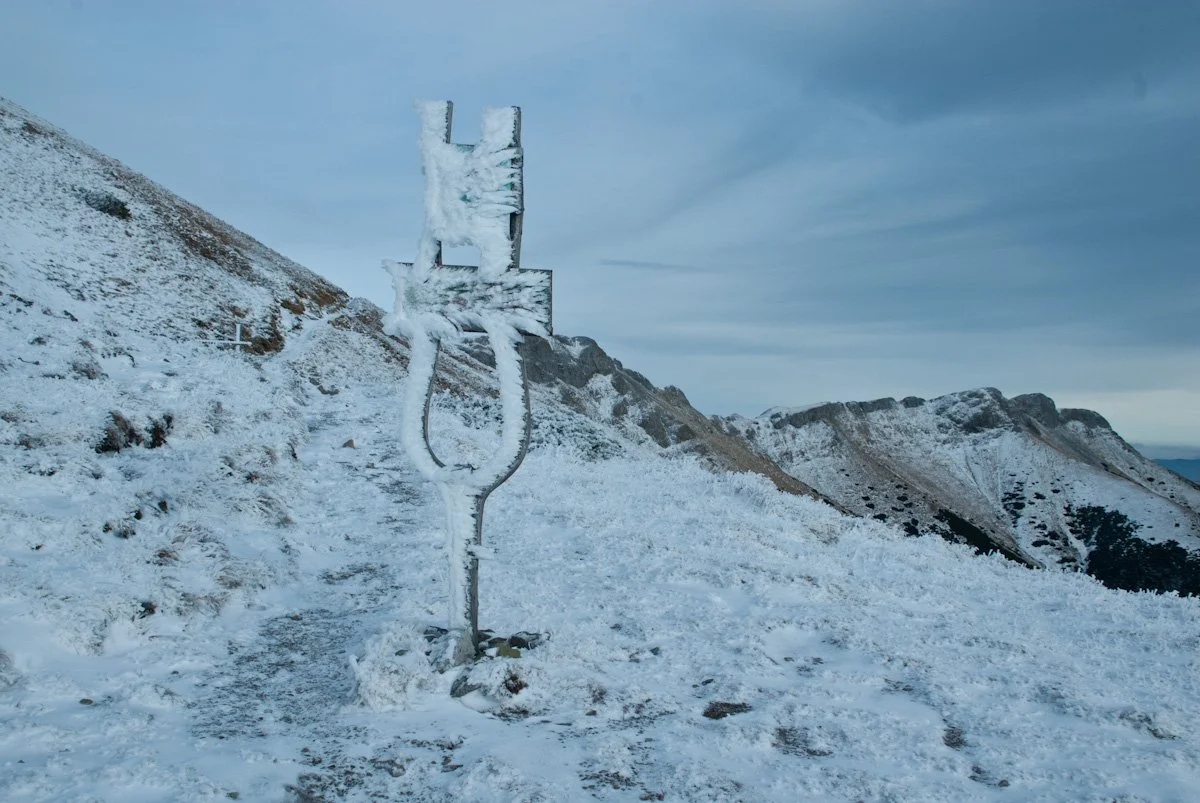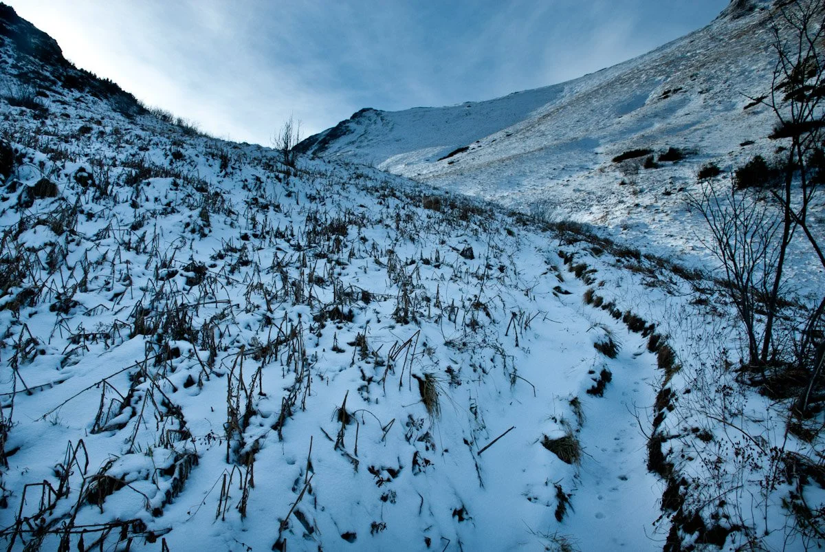 So... I would be the one to evaluate whether or not the trail was ‘too dangerous’ to go on... I followed a creek for about a half hour, and then the trail started to climb, fast. I followed the switchbacks up the granite walls for an hour and a half, first frost, then snow building up along the path. As I was beginning to question the integrity of the trail, the landscape opened up and flattened out. I found myself trudging along through snow drifts above the tree line. But it was much flatter now and easily navigable. I was in the saddle. Wally and I pushed on and a half hour later we crested the saddle, and entered the High Tatras mountains. I had no idea what to expect... it was unbelievable... what a sight.